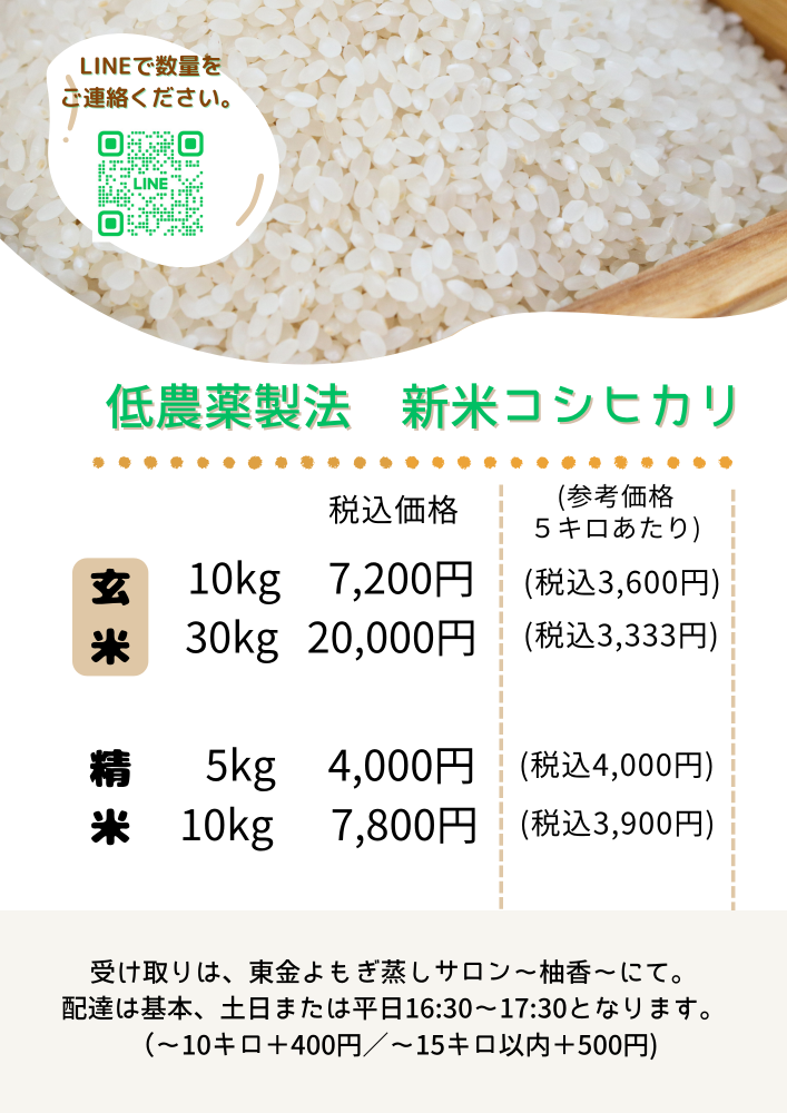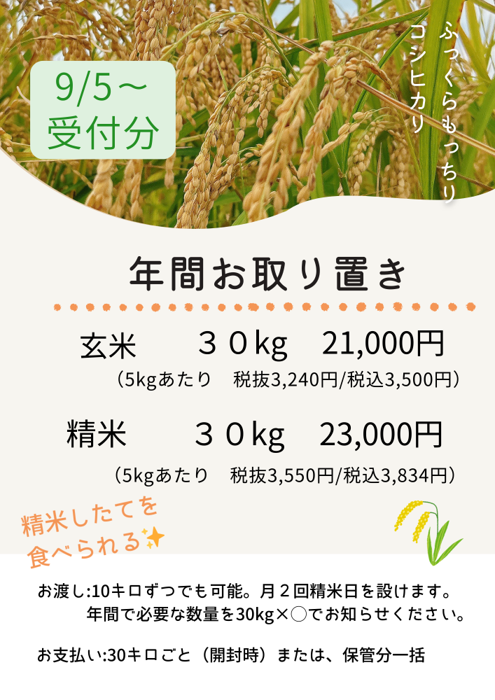 | (精米) | 10キロ毎に【+100円】 精米しますと全体から3〜4キロ減りますので、精米30キロのお渡しではありません。 |